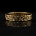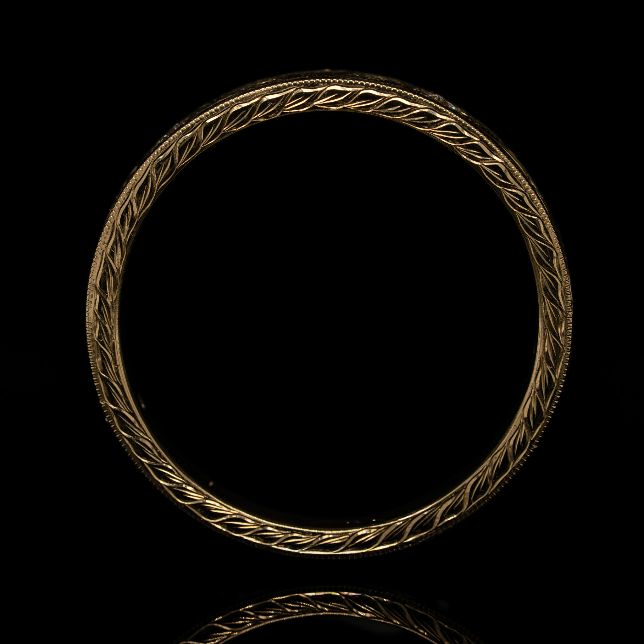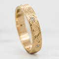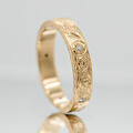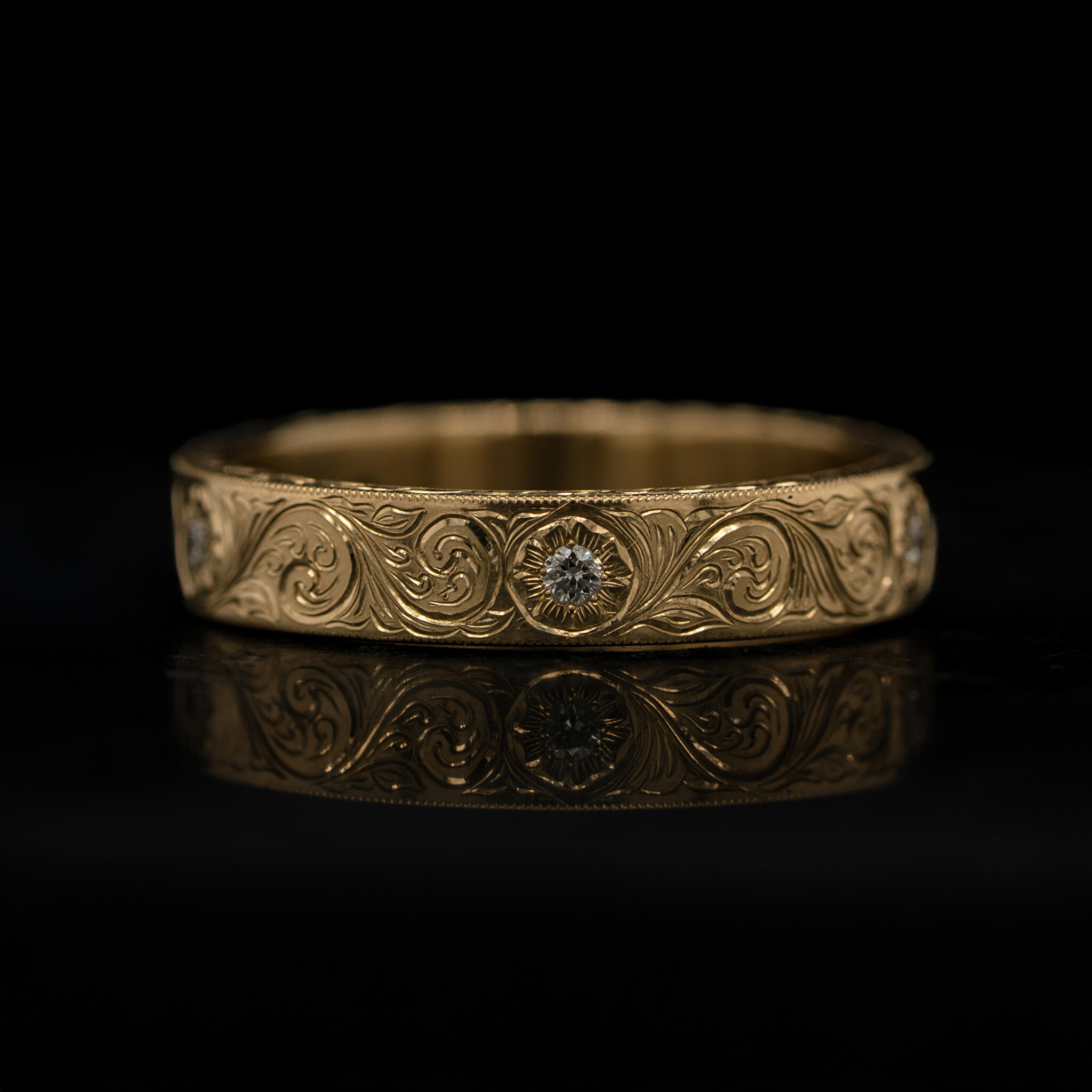 Een simpele gouden band omtoveren tot iets unieks.. Aan de hand van de klassieke 'scrollwork' techniek is deze ring gegraveerd. In de ring zitten vijf diamanten die het centrum zijn van gegraveerde bloemen. Zelfs de zijkant hebben we versierd met een blad patroon. Doordat de ring geen uitstekende delen heeft, is deze erg fijn te dragen. Je merkt niet dat er iets om je vinger zit, maar als je er naar kijkt kun je je ogen er niet vanaf houden!
