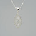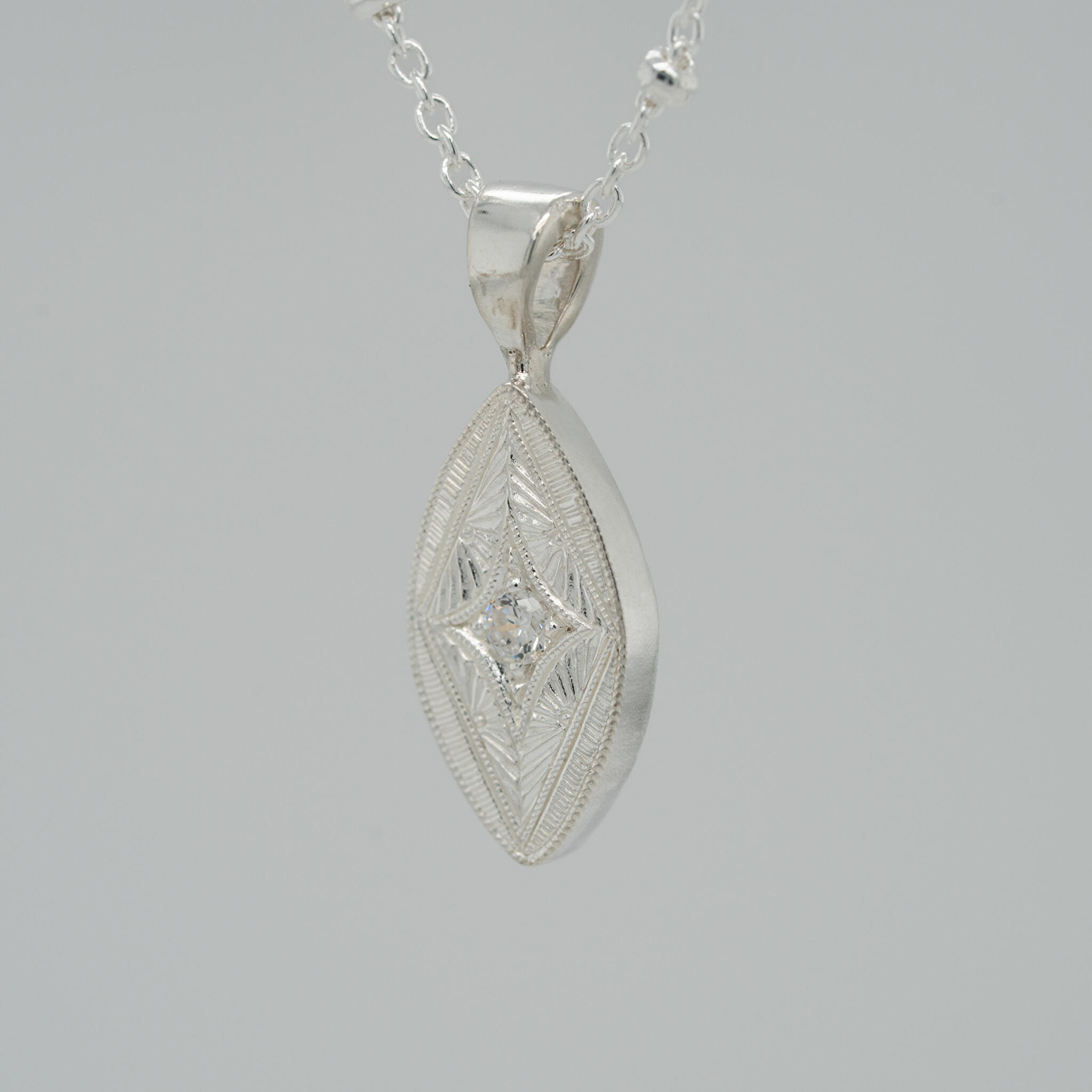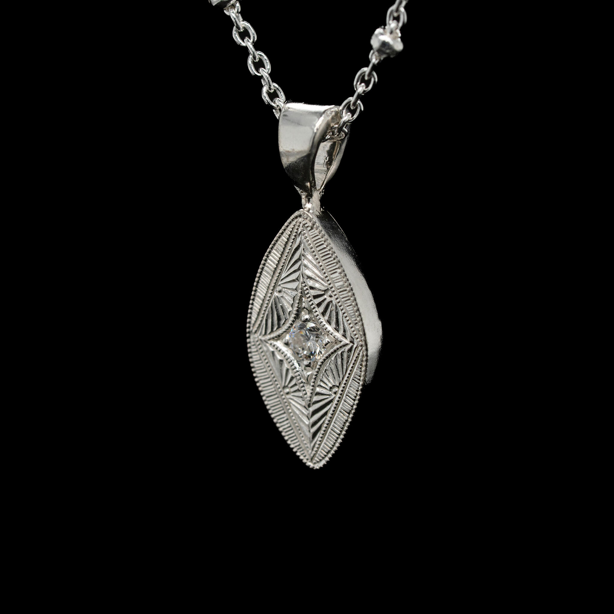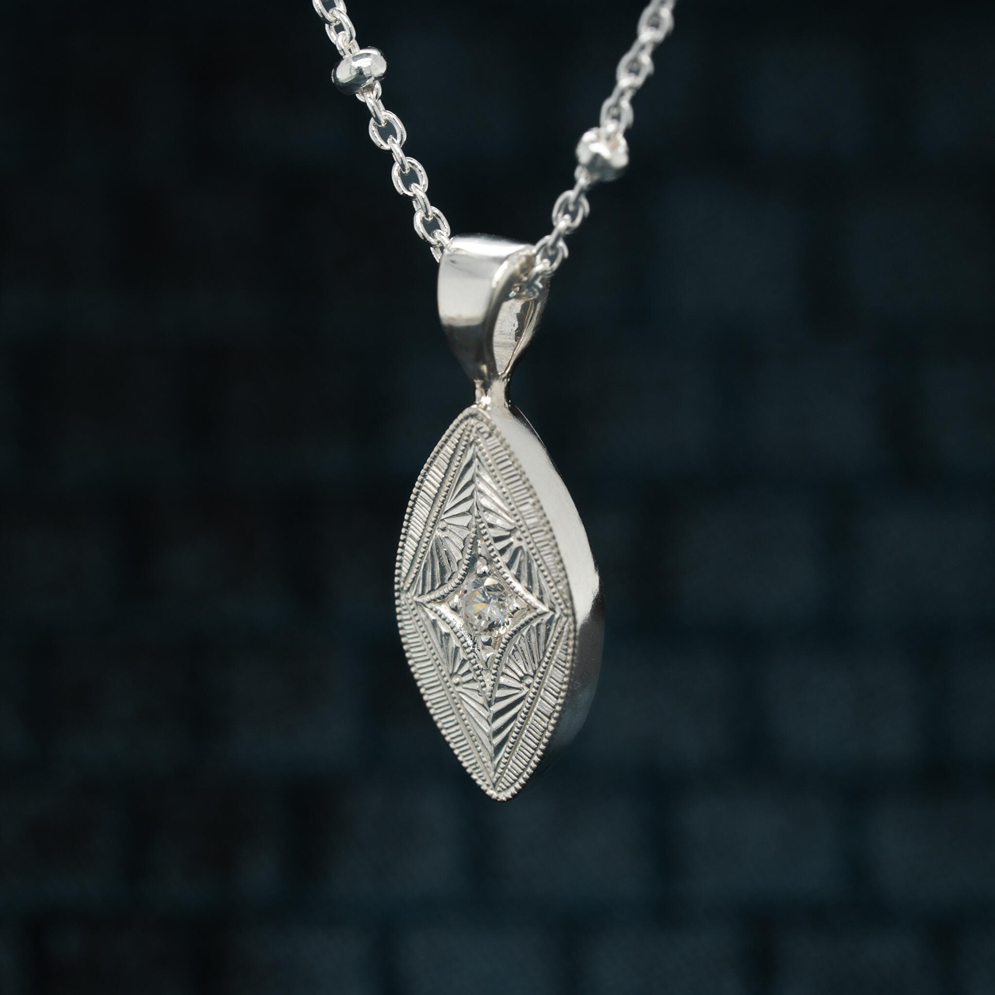 Ook al zit er maar een klein diamantje in deze hanger, trekt het toch de aandacht door het art deco gevoel. Dit komt mede door het radiale patroon, wat doet denken aan zonnestralen. Geen grote glimmende oppervlakken, maar juist kleine graveringen zodat de hanger met het licht kan spelen.