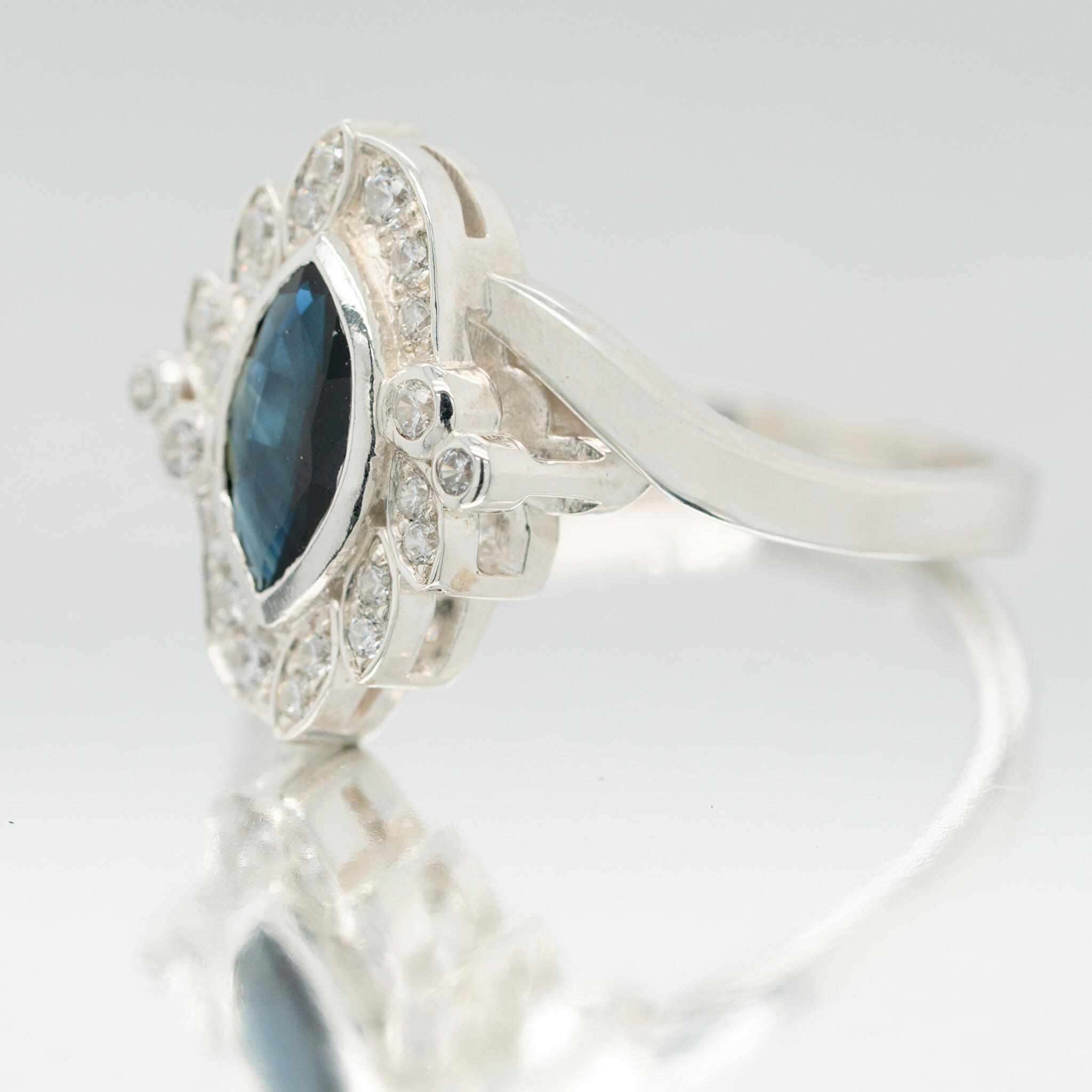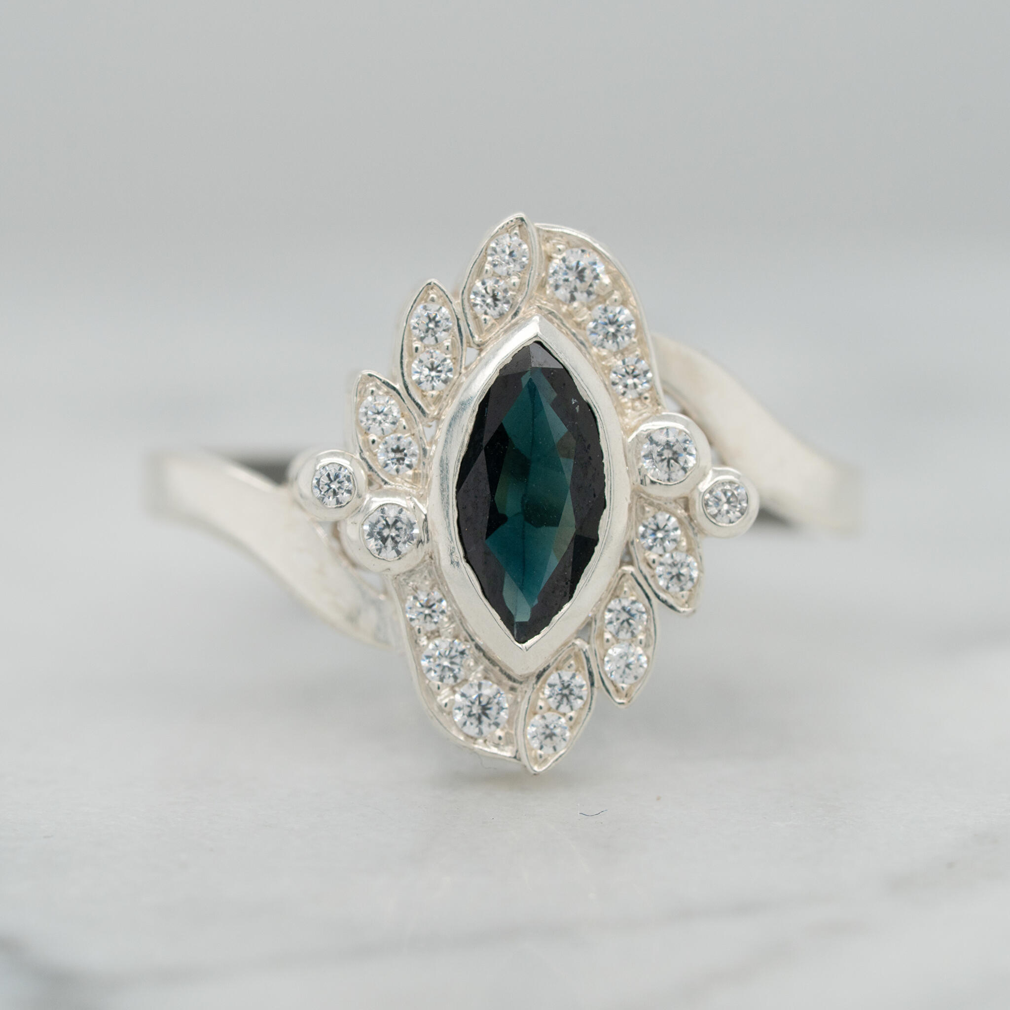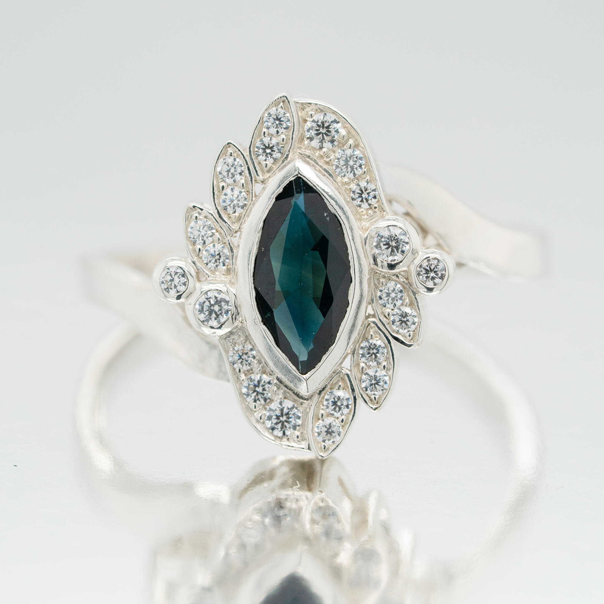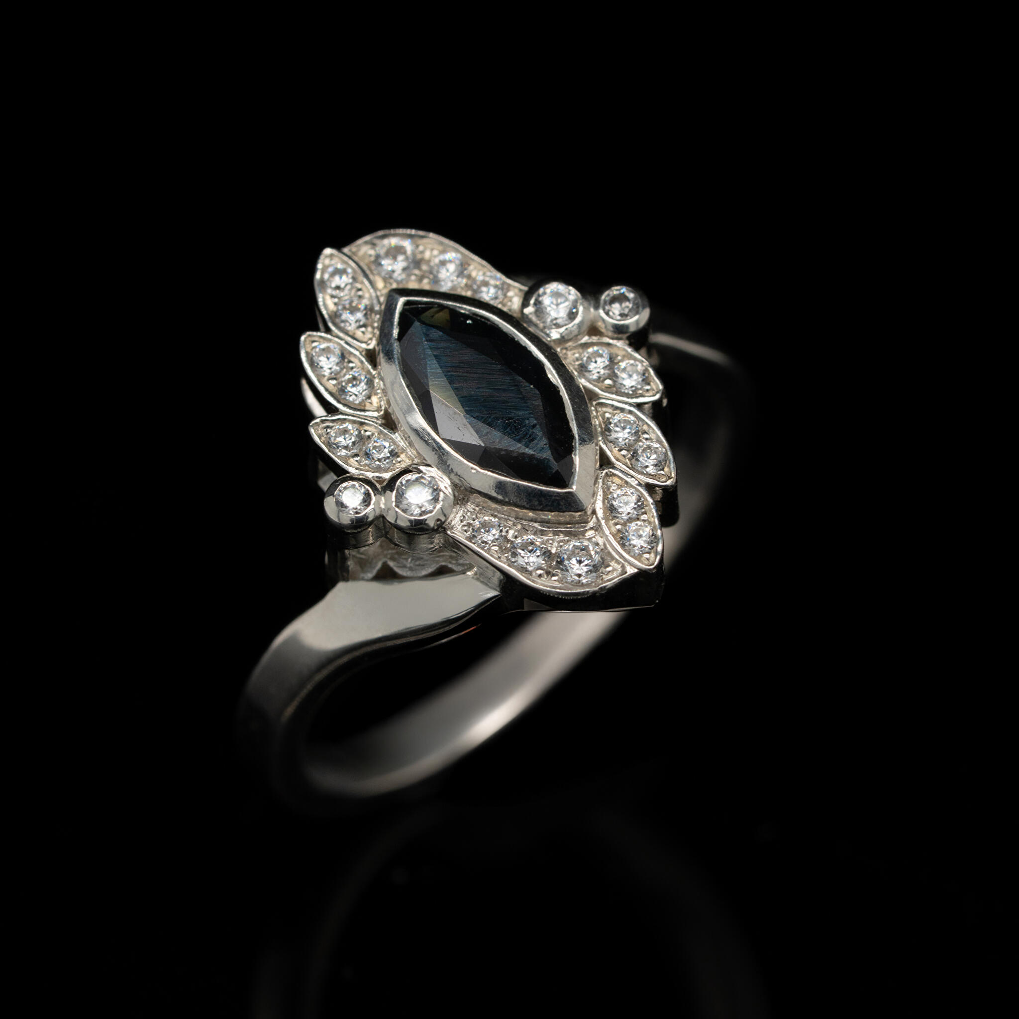 De klant wilde graag een vintage achtige stijl, maar zonder graveringen of millegriffe. Daarom hebben we gekozen voor een marquise geslepen vorm steen en deze marquise vorm terug gebracht bij de kleine witte diamanten. Ook hebben we gekozen voor een scheen met een zijslag. Als hoofdsteen hebben we een intens diepe blauwe saffier gebruikt, wat goed tot z'n recht komt in een vintage stijl.