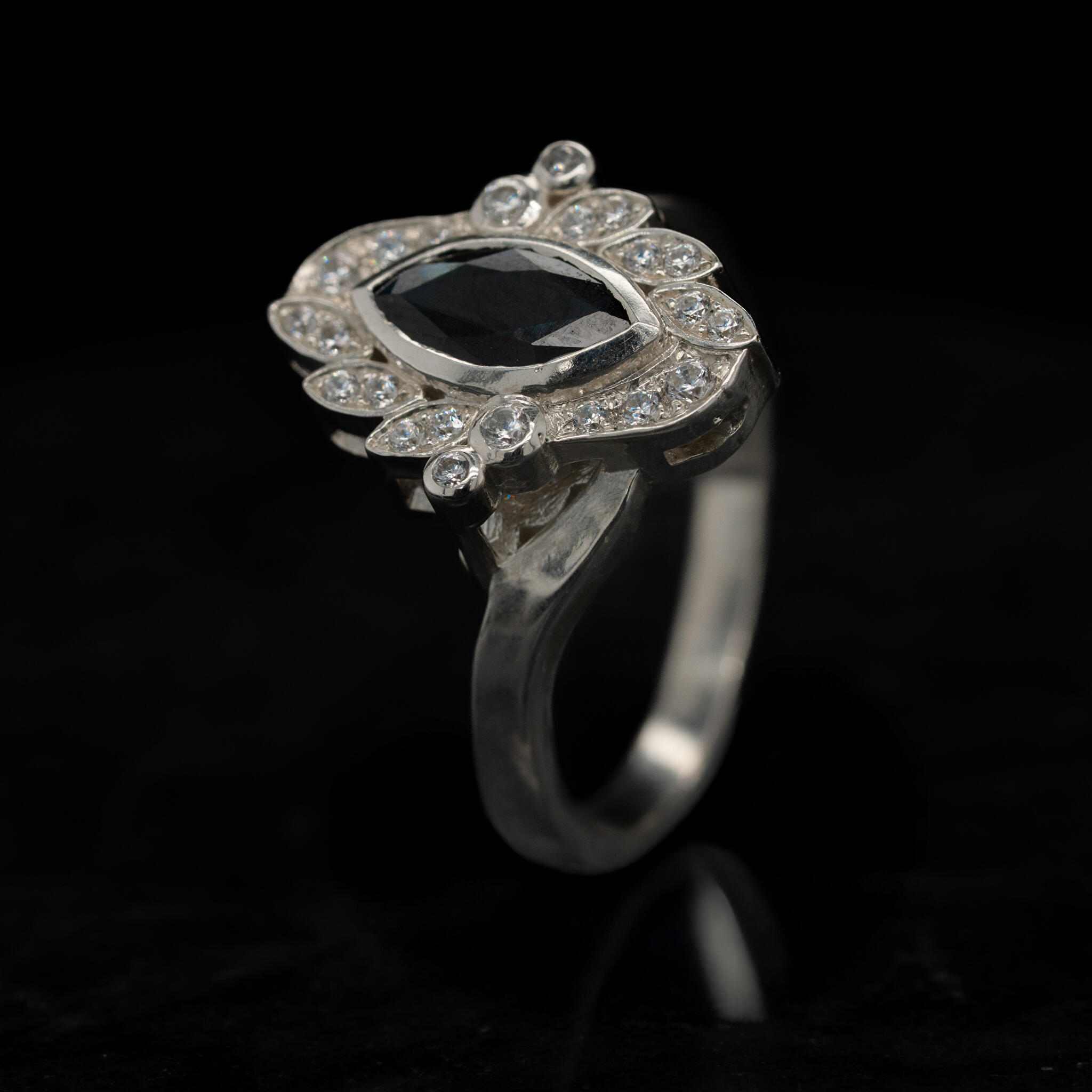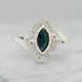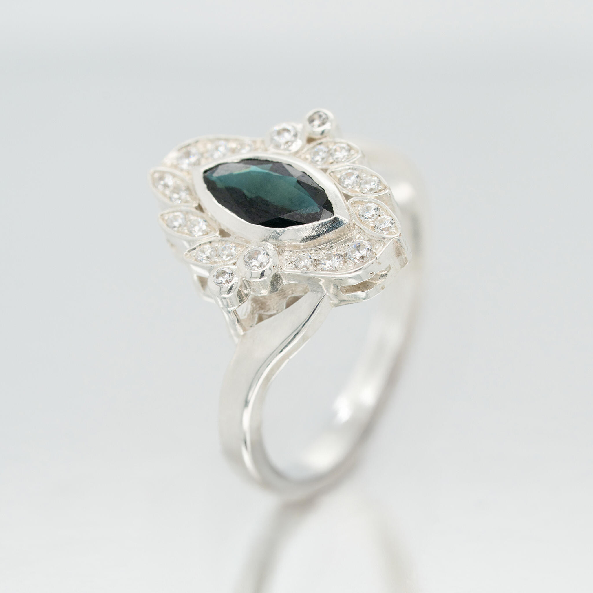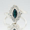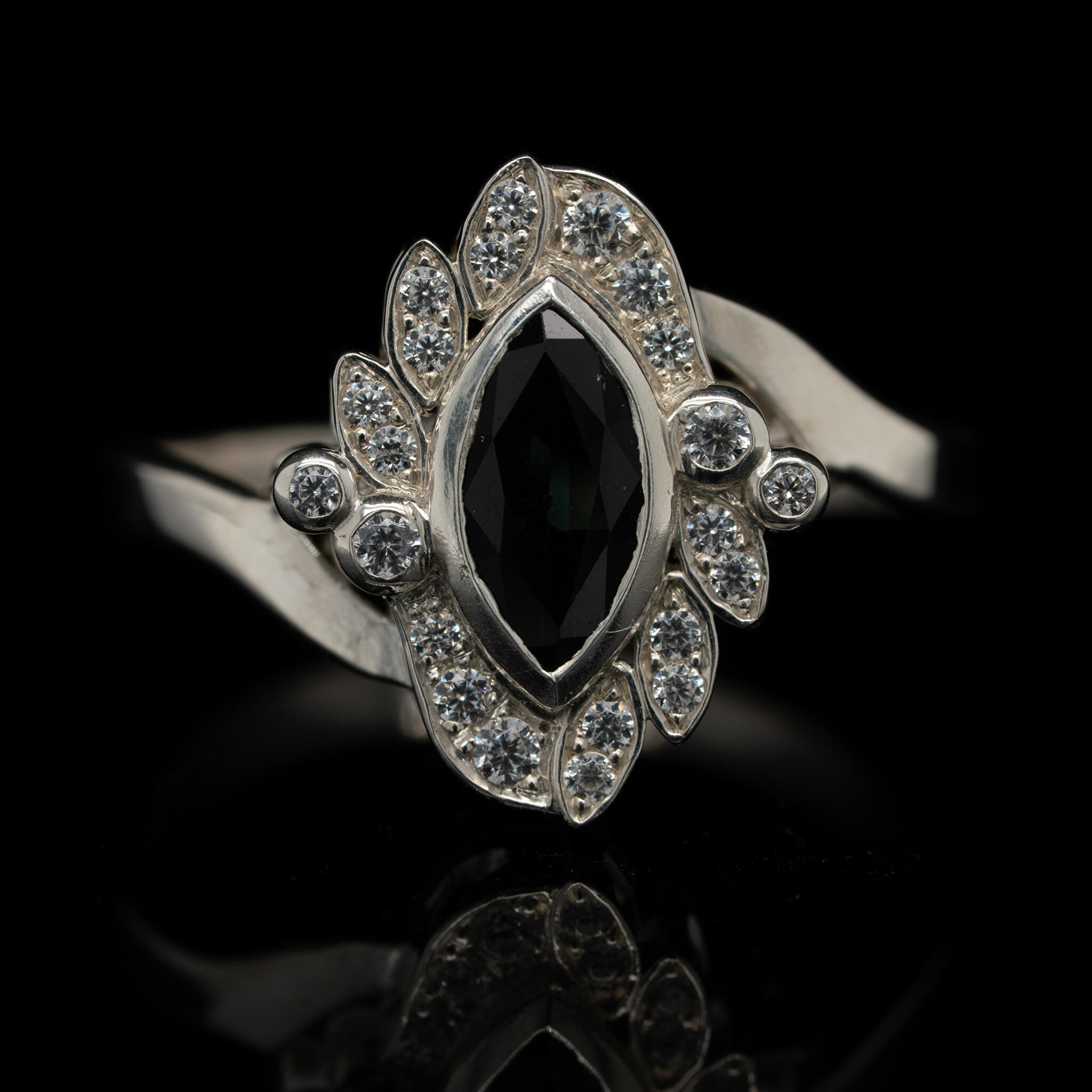 De klant wilde graag een vintage achtige stijl, maar zonder graveringen of millegriffe. Daarom hebben we gekozen voor een marquise geslepen vorm steen en deze marquise vorm terug gebracht bij de kleine witte diamanten. Ook hebben we gekozen voor een scheen met een zijslag. Als hoofdsteen hebben we een intens diepe blauwe saffier gebruikt, wat goed tot z'n recht komt in een vintage stijl.