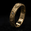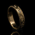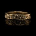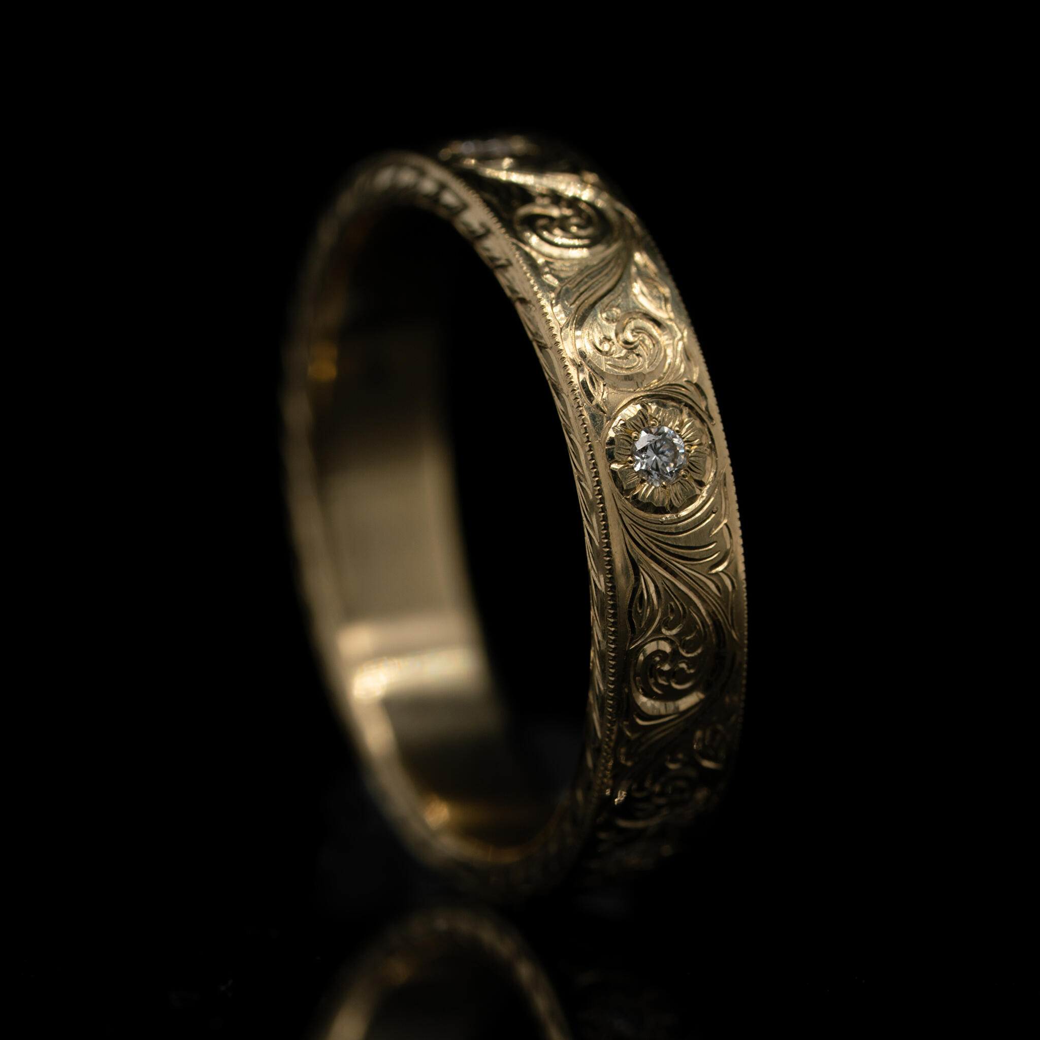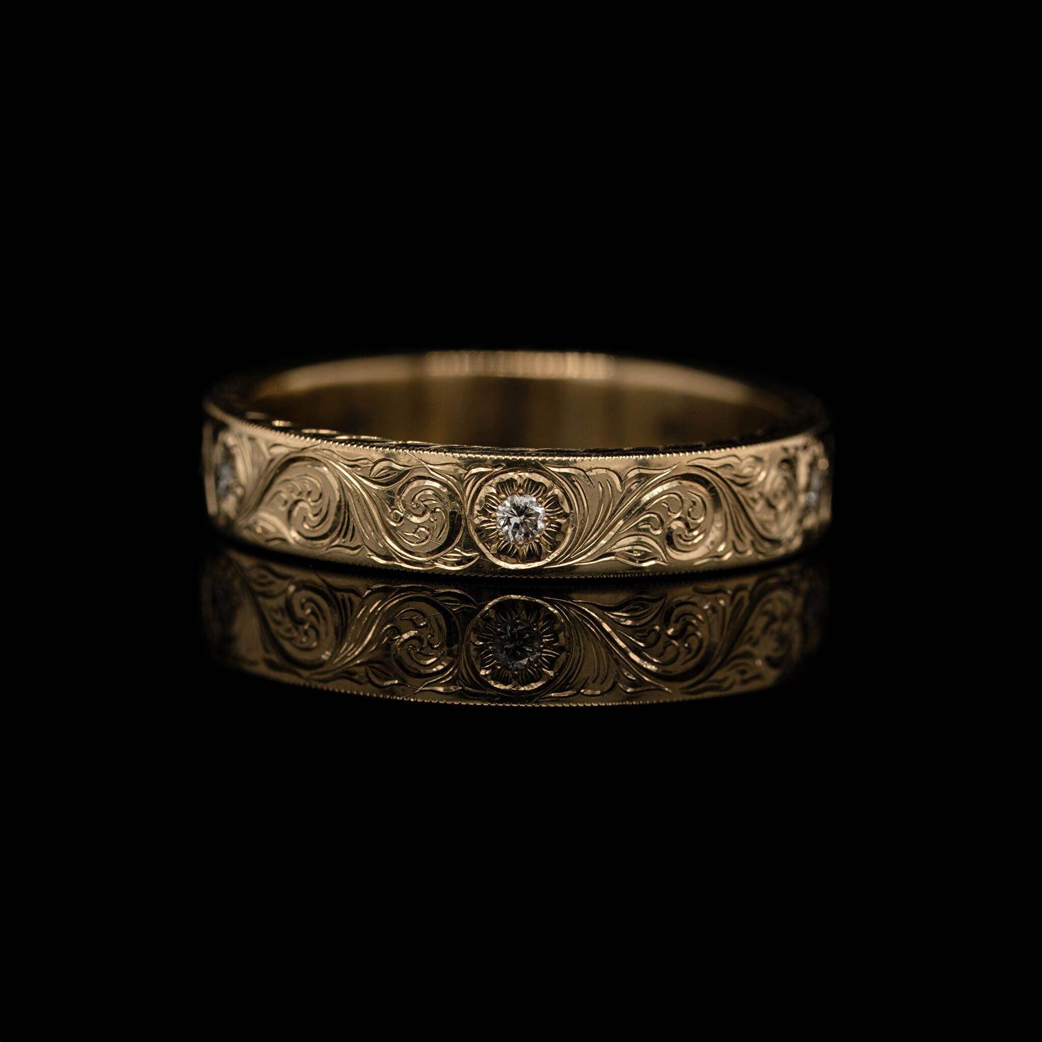 Een simpele gouden band omtoveren tot iets unieks.. Aan de hand van de klassieke 'scrollwork' techniek is deze ring gegraveerd. In de ring zitten vijf diamanten die het centrum zijn van gegraveerde bloemen. Zelfs de zijkant hebben we versierd met een blad patroon. Doordat de ring geen uitstekende delen heeft, is deze erg fijn te dragen. Je merkt niet dat er iets om je vinger zit, maar als je er naar kijkt kun je je ogen er niet vanaf houden!