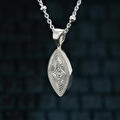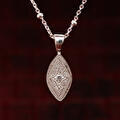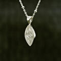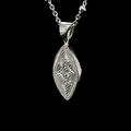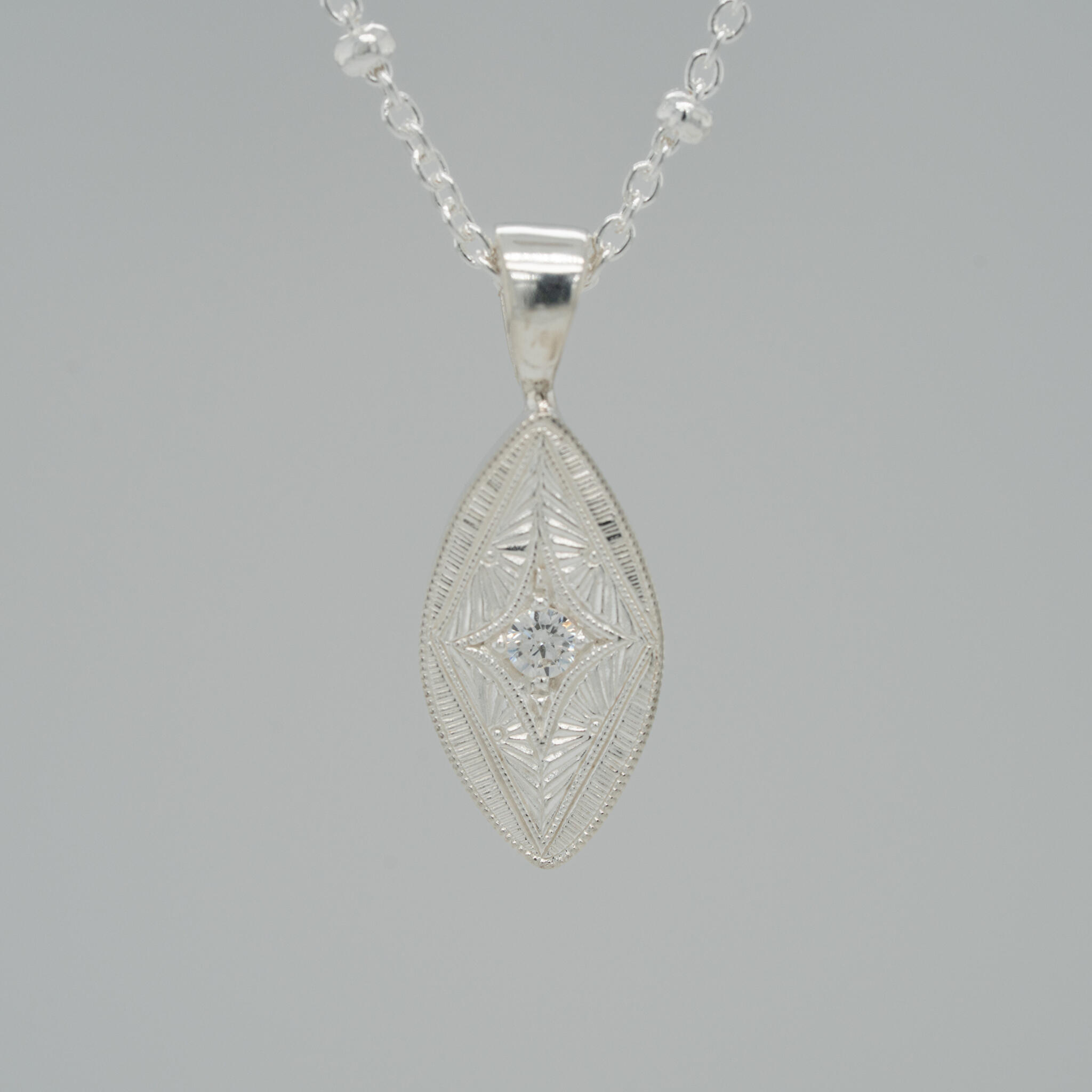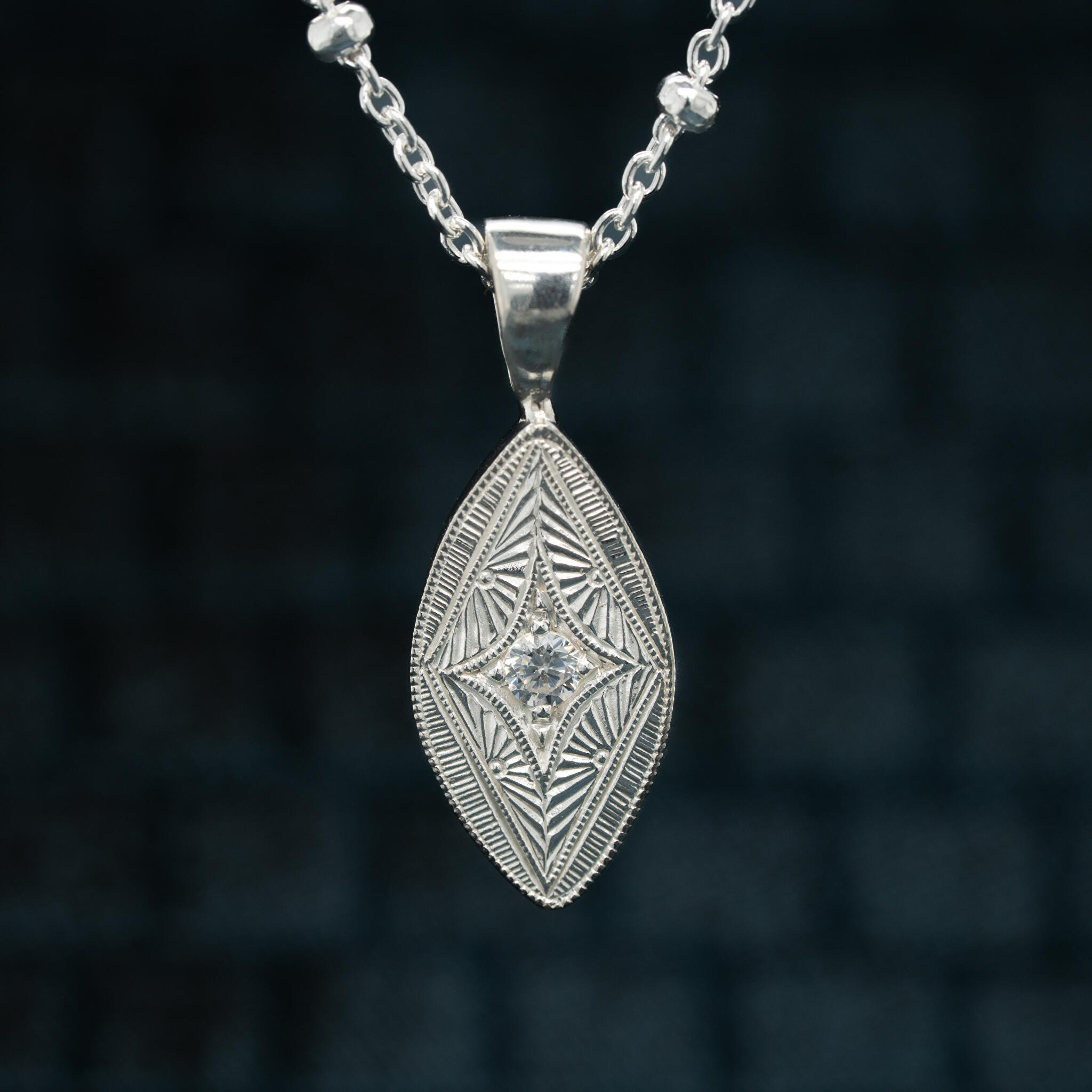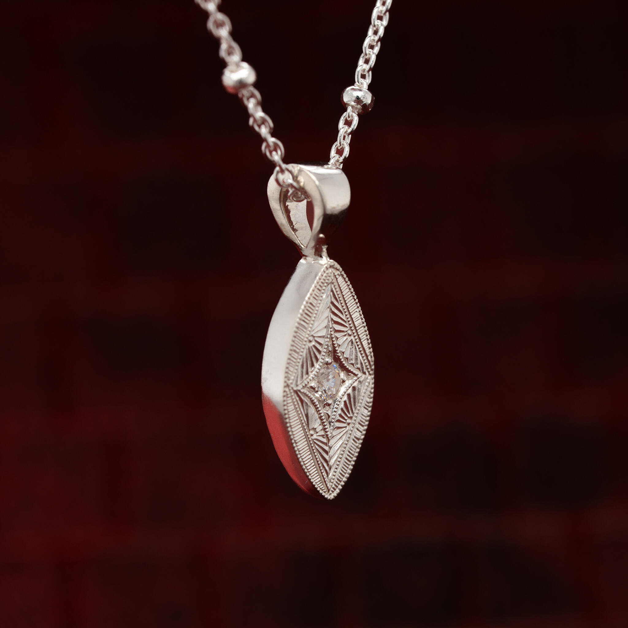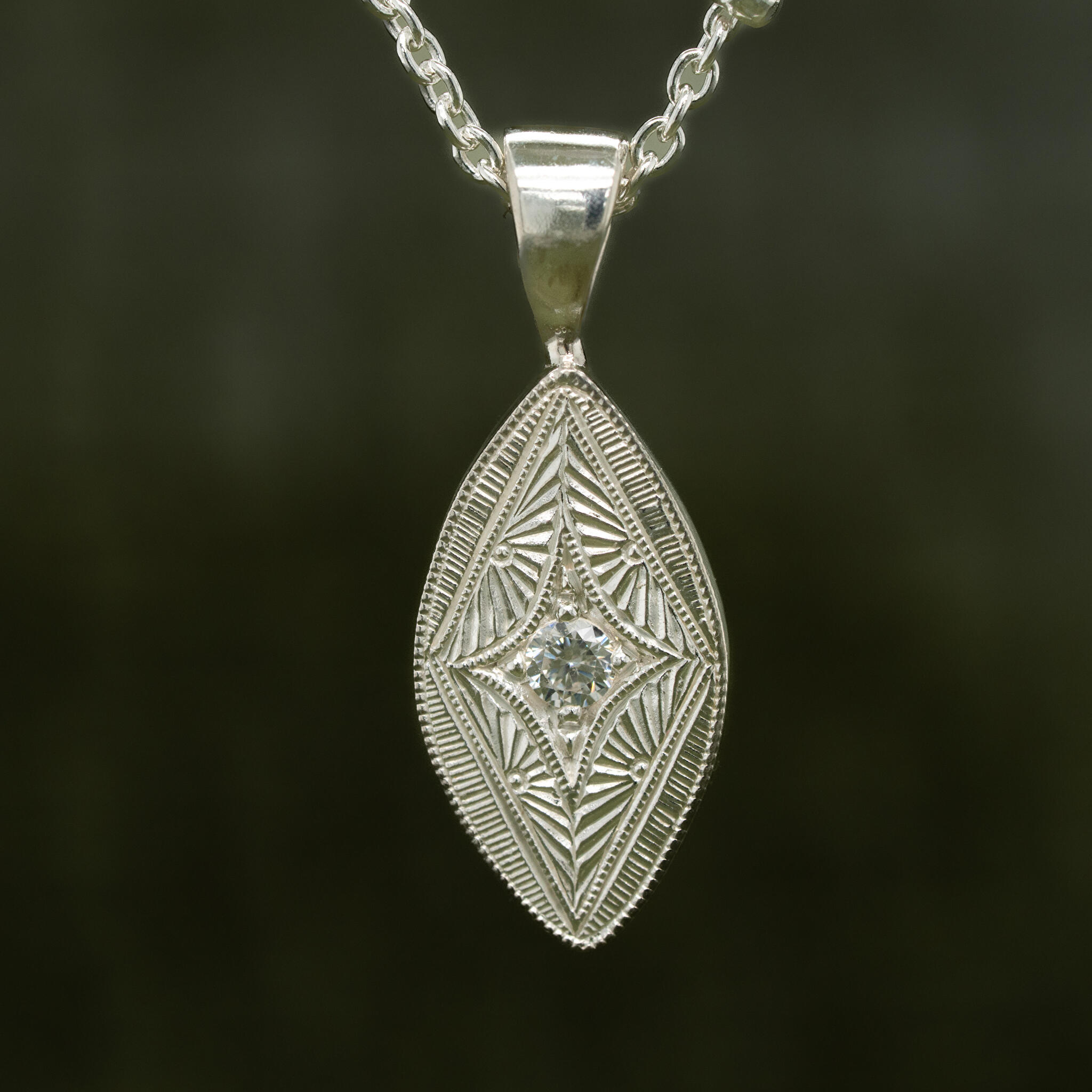 Ook al zit er maar een klein diamantje in deze hanger, trekt het toch de aandacht door het art deco gevoel. Dit komt mede door het radiale patroon, wat doet denken aan zonnestralen. Geen grote glimmende oppervlakken, maar juist kleine graveringen zodat de hanger met het licht kan spelen.